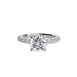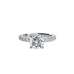 This solitaire engagement ring features a brilliant center stone framed by a slender band of pavé-set diamonds that adorn the top of the band.