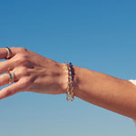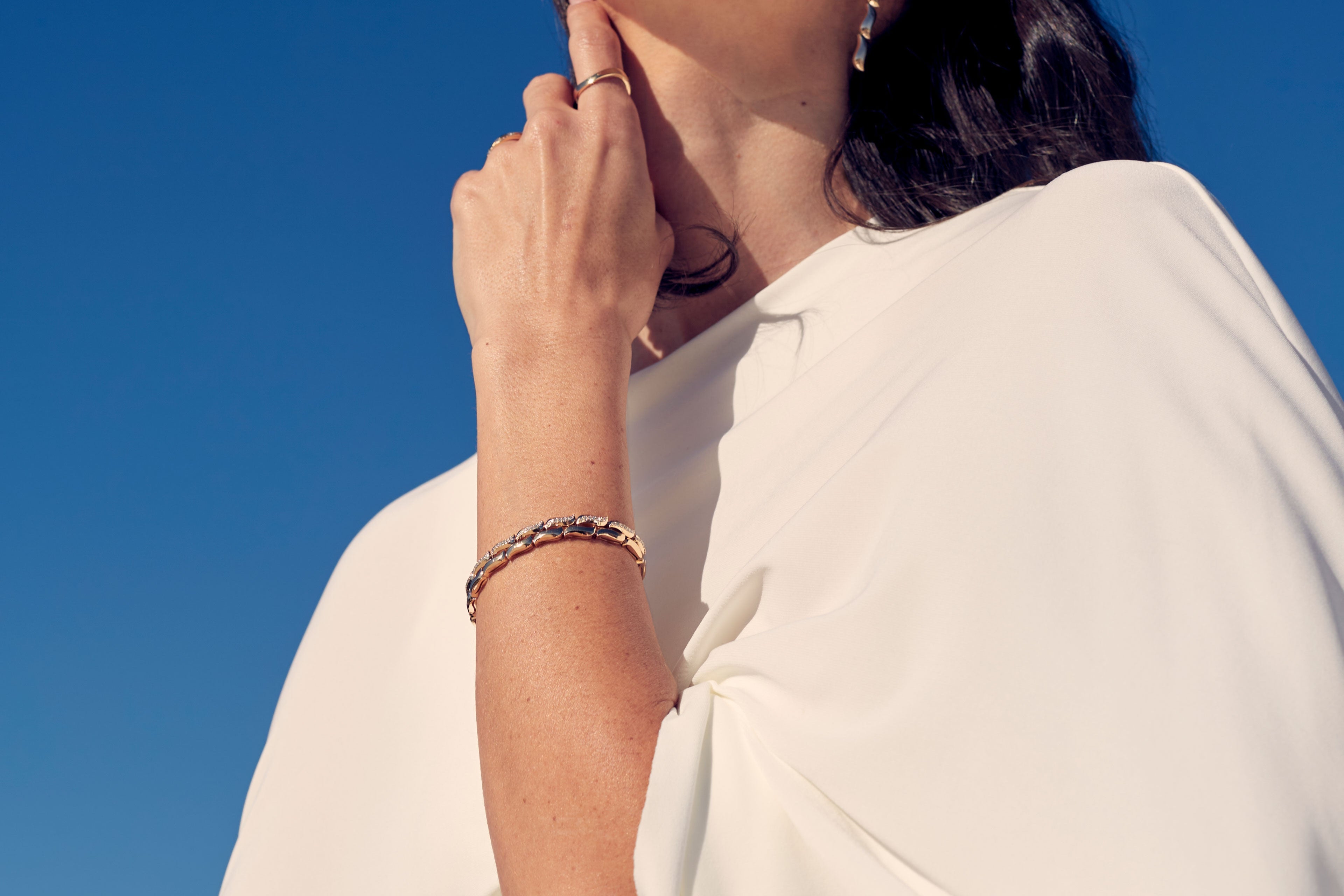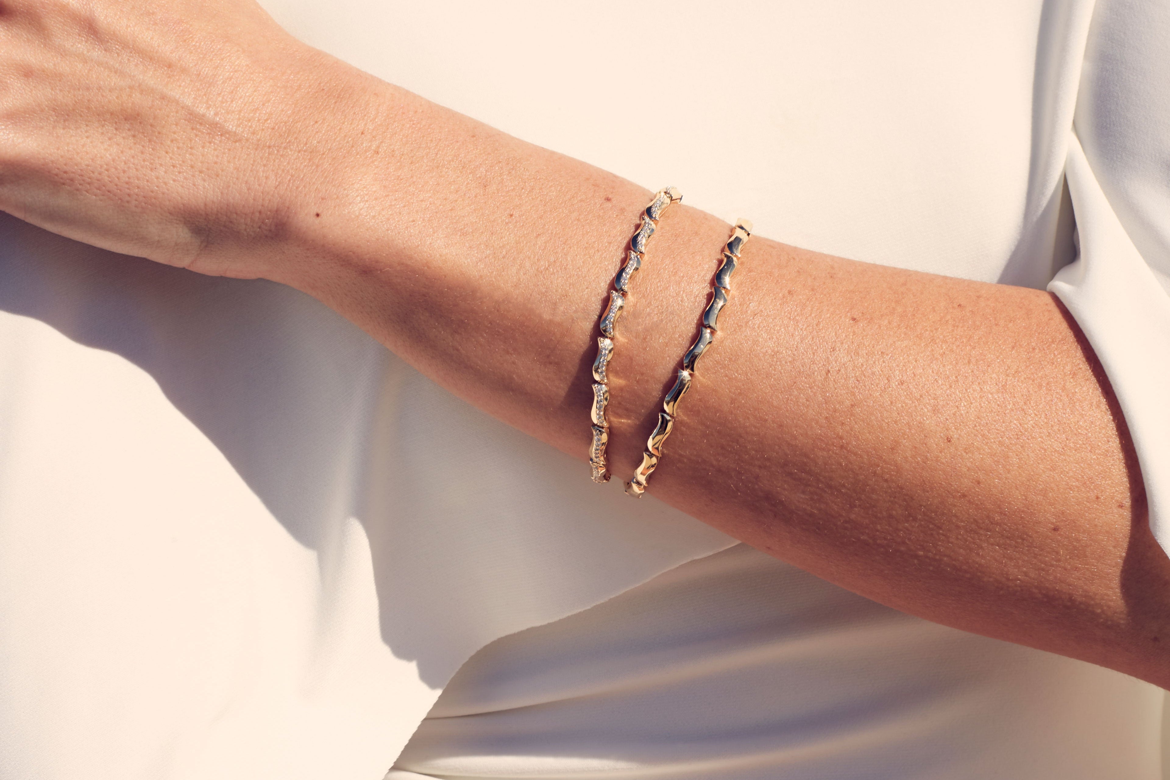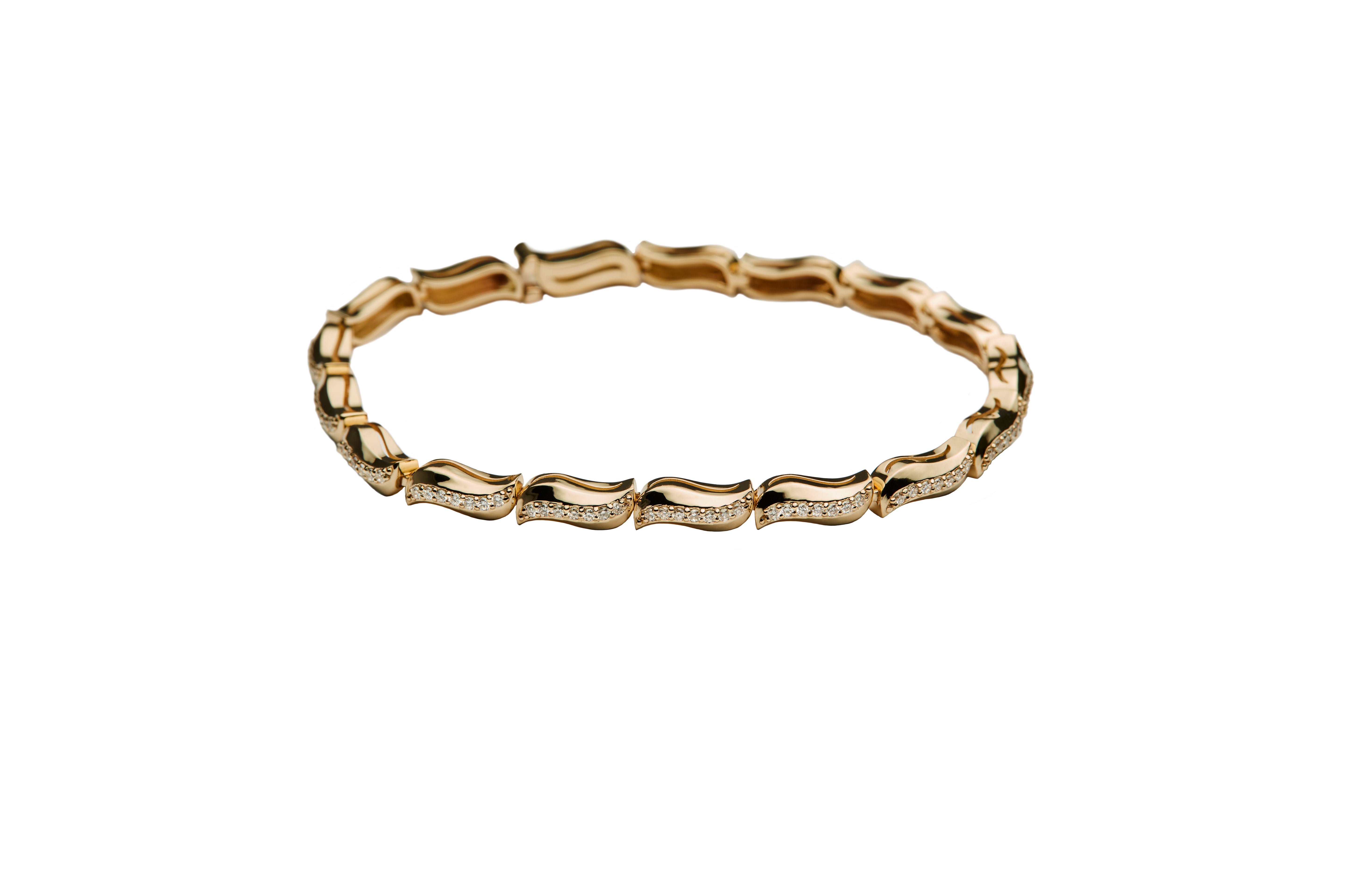 Fluid yet structured, the Swell Bracelet is a continuous motion of linked gold and diamonds. Like a swell—deep ocean waves gathering strength as they travel before rising and breaking on the shore.